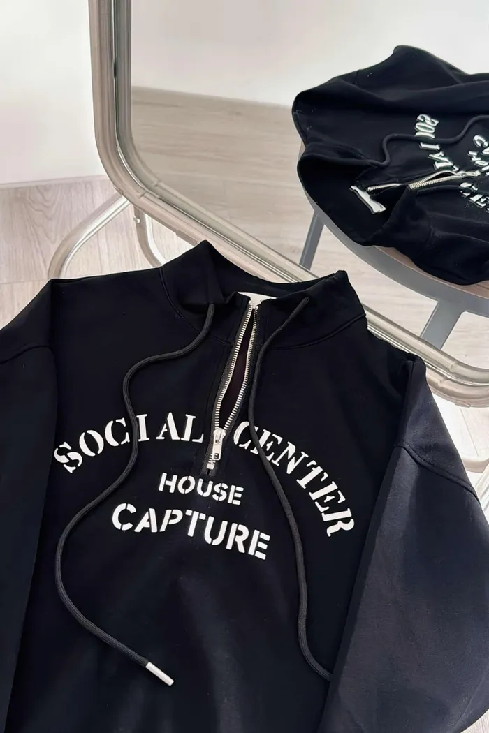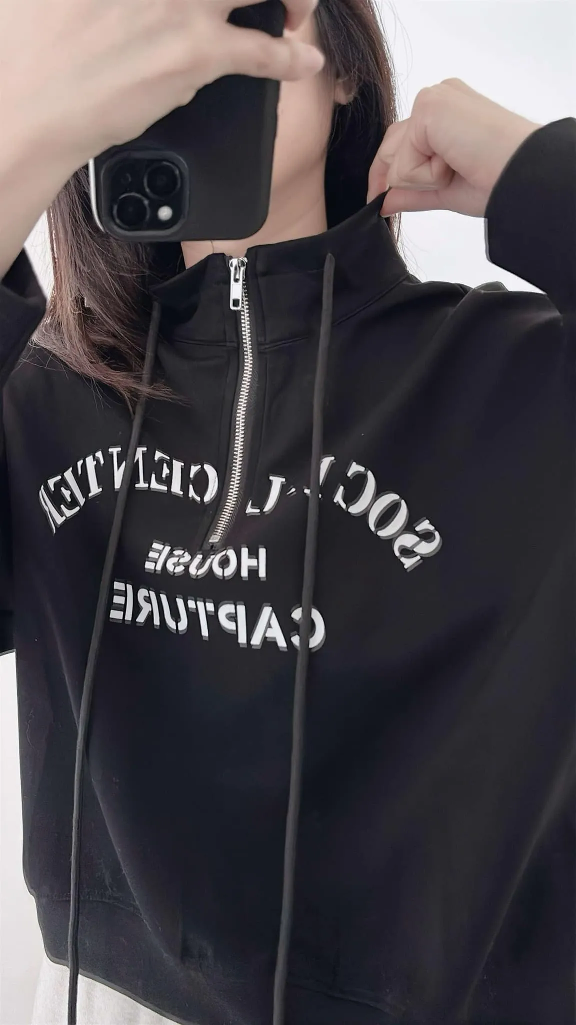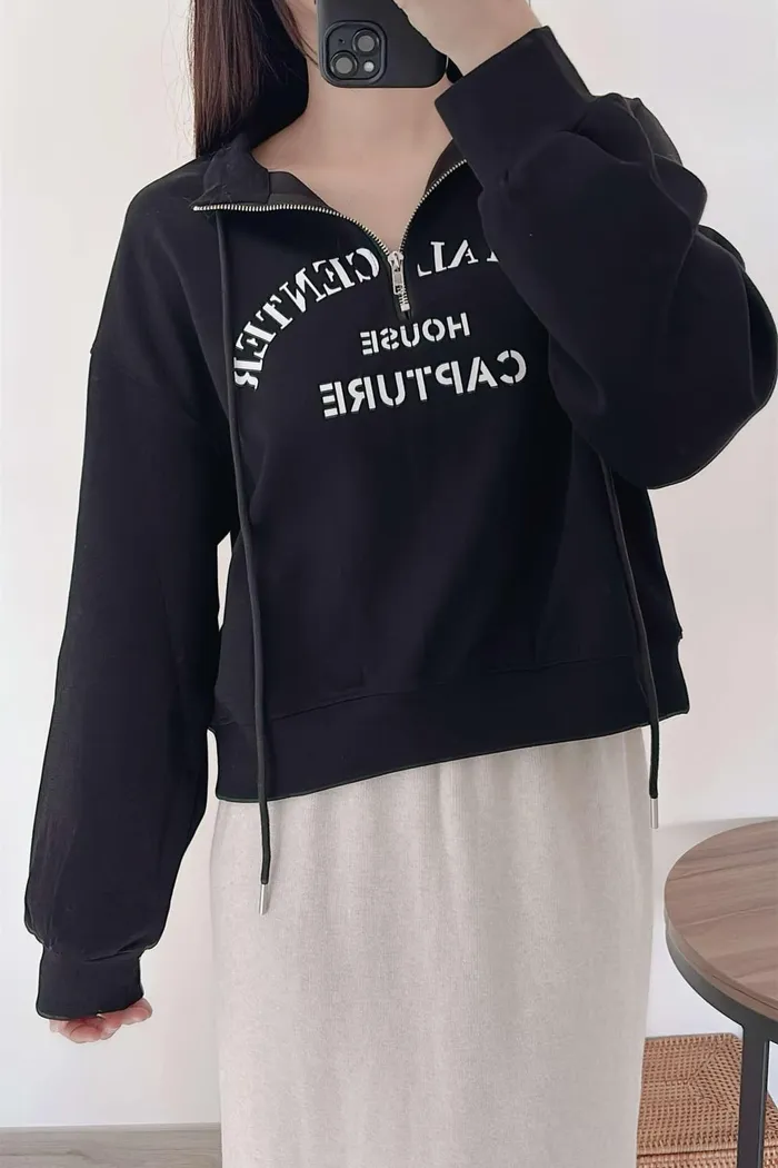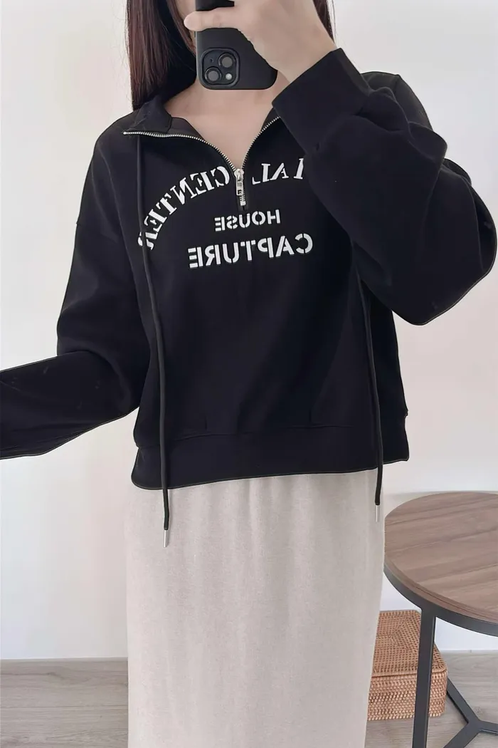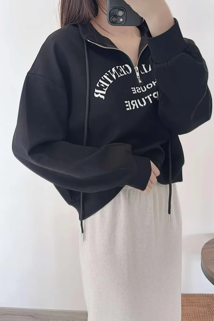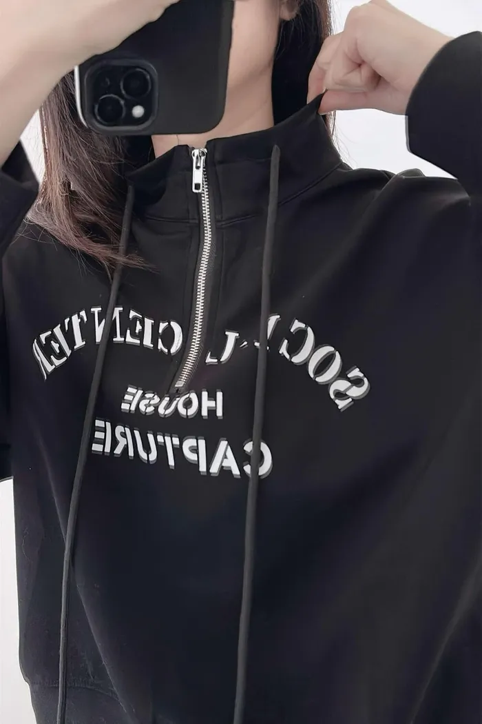 推薦款/薄款前拉鍊簡約文字上衣/大胸友善/內無刷毛
