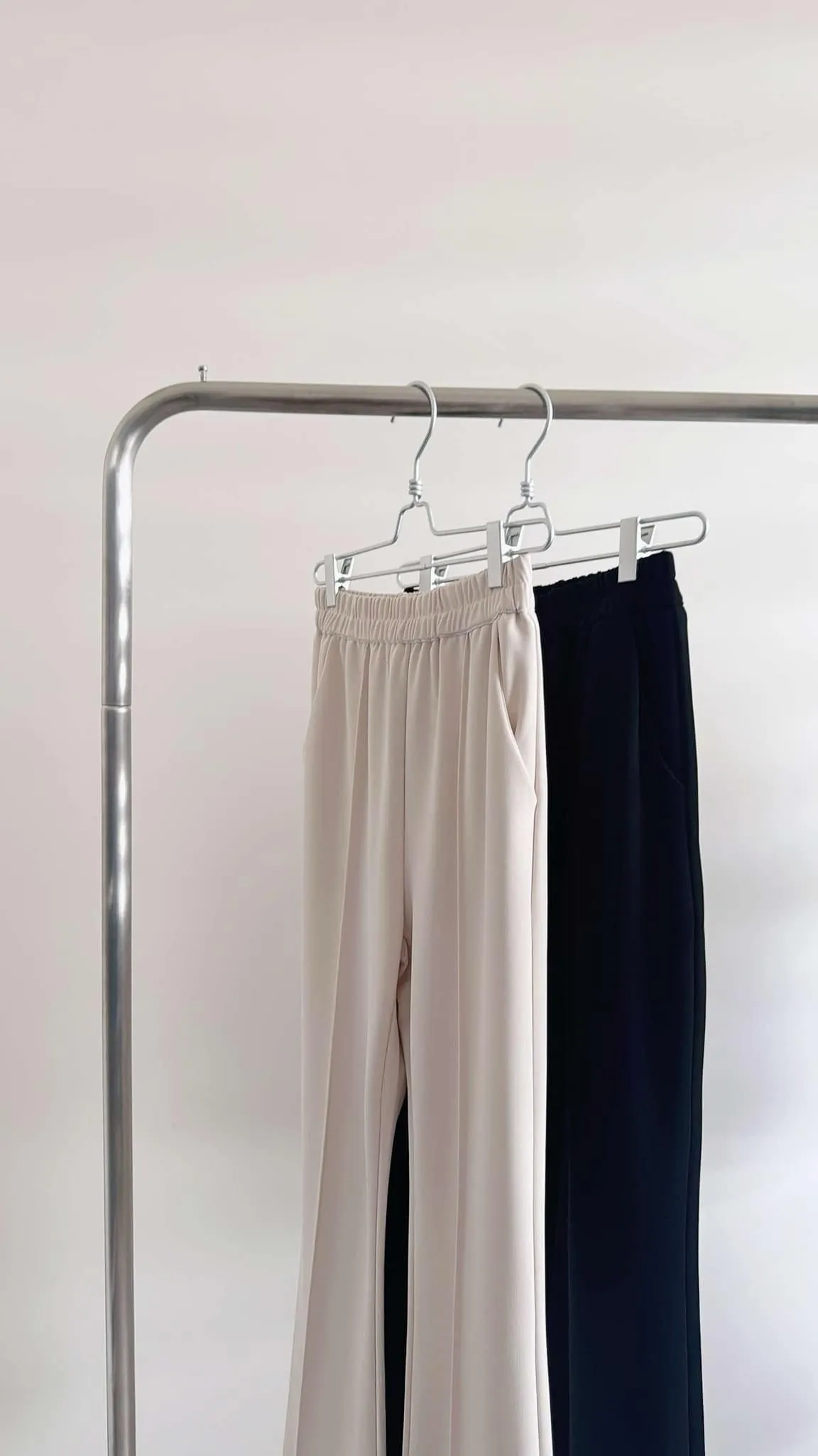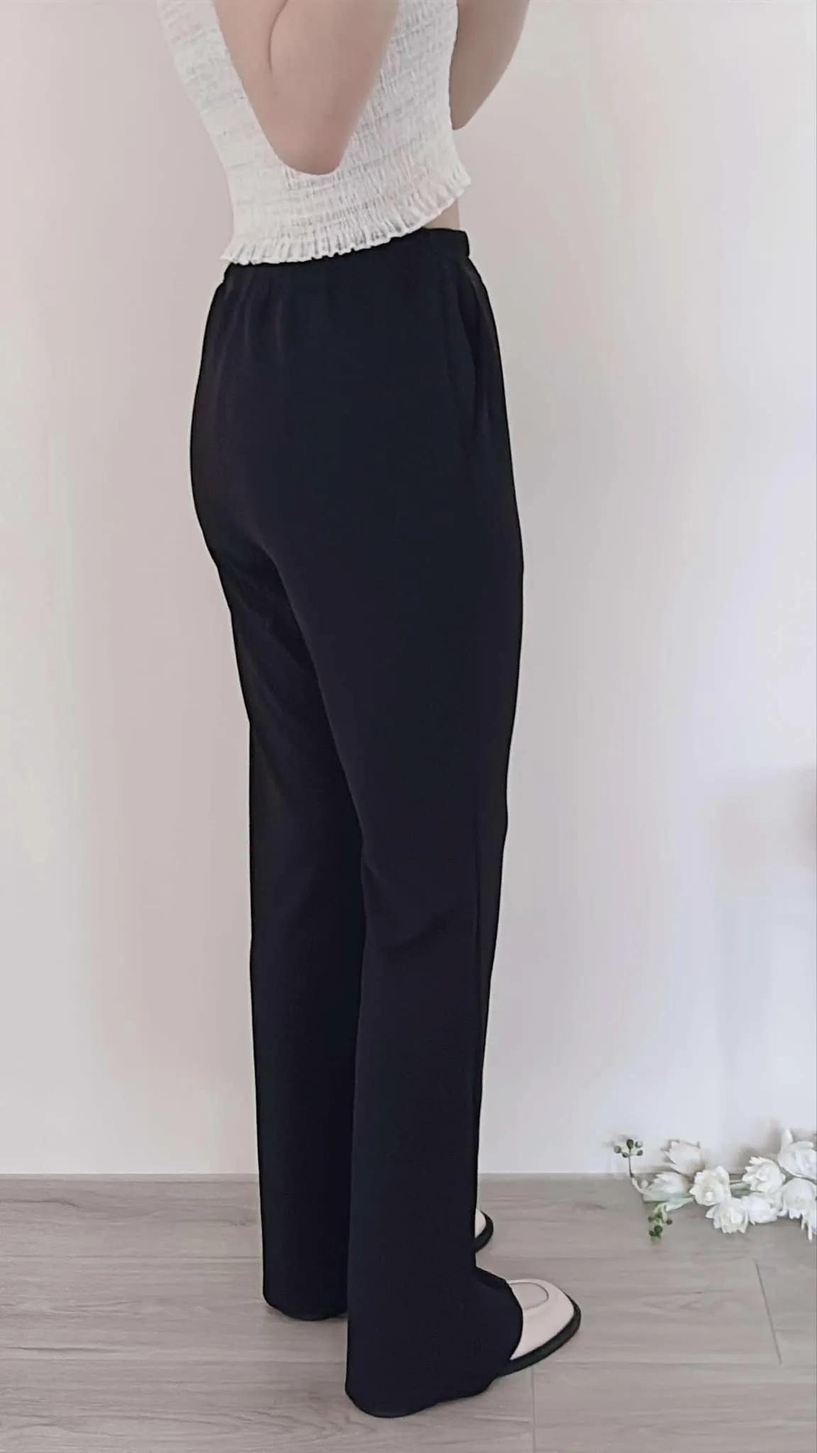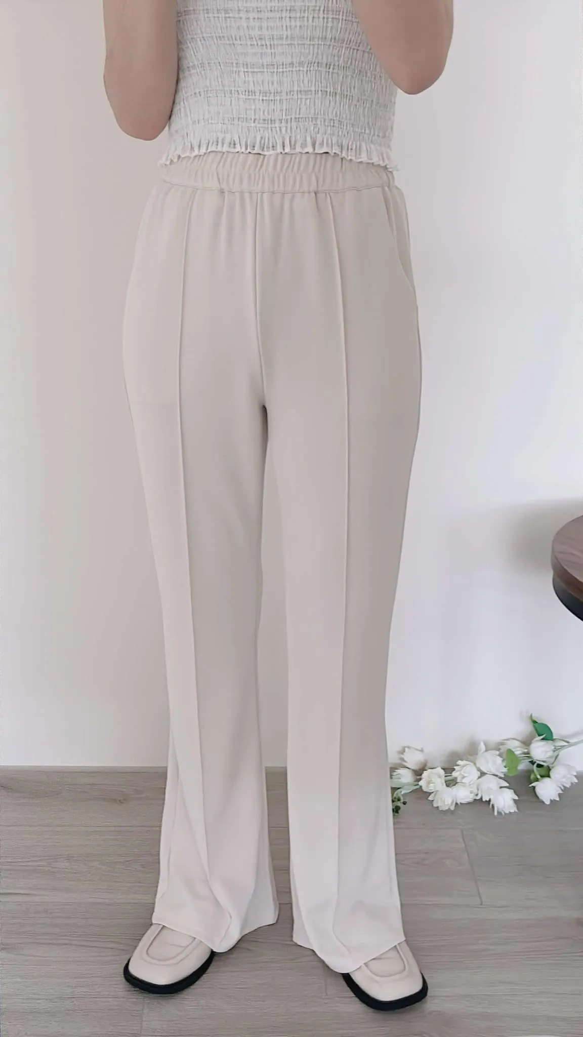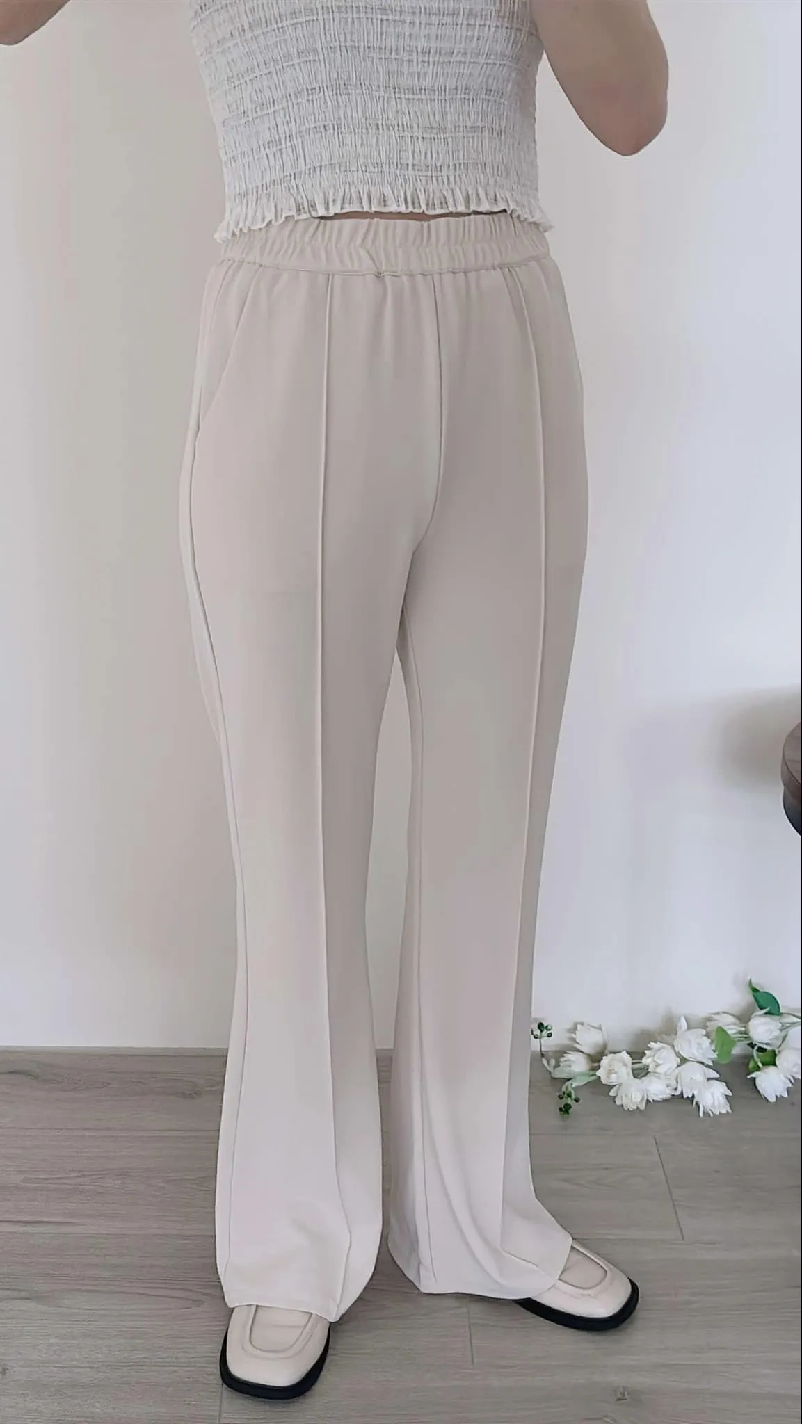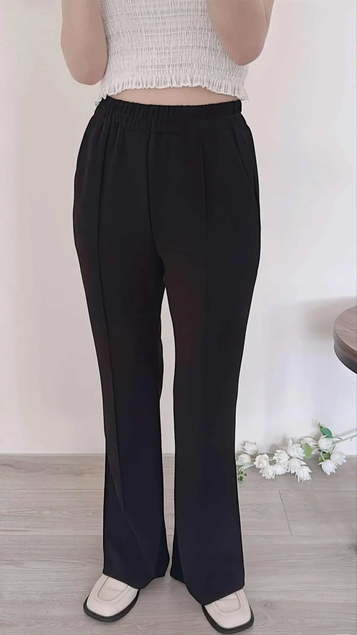 輕薄款/前立體壓線雪紡喇叭褲/全鬆緊腰/有口袋