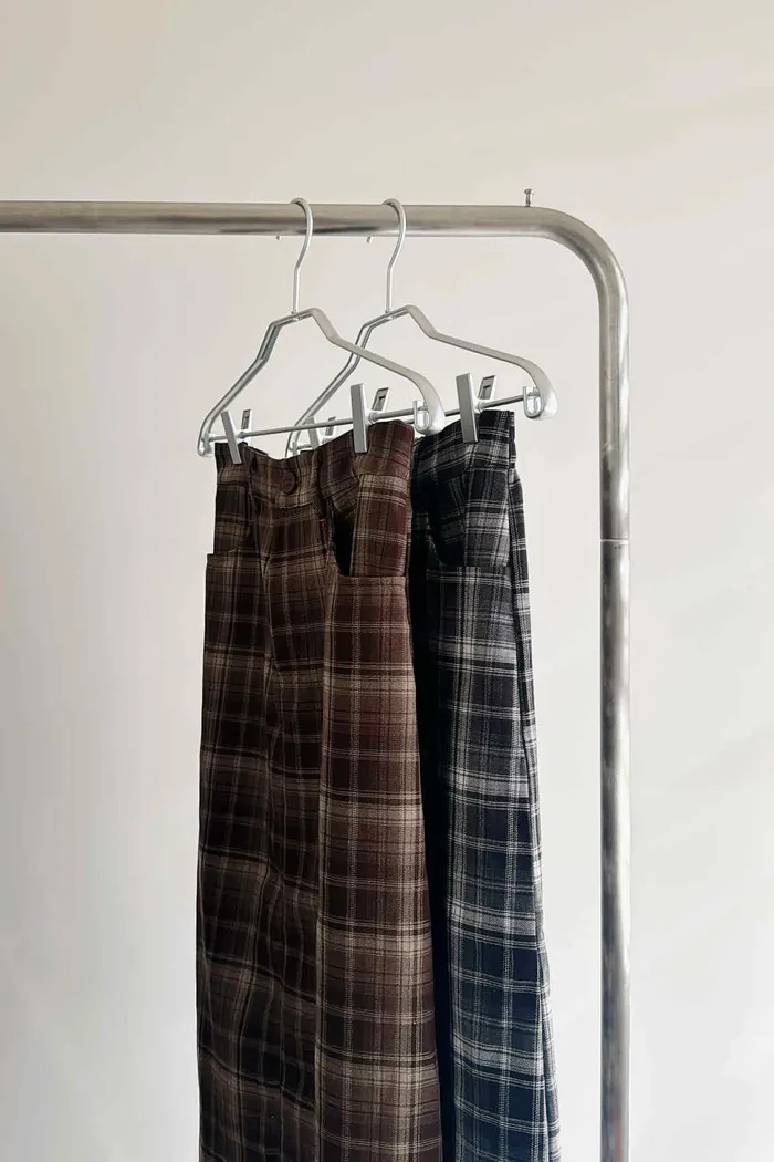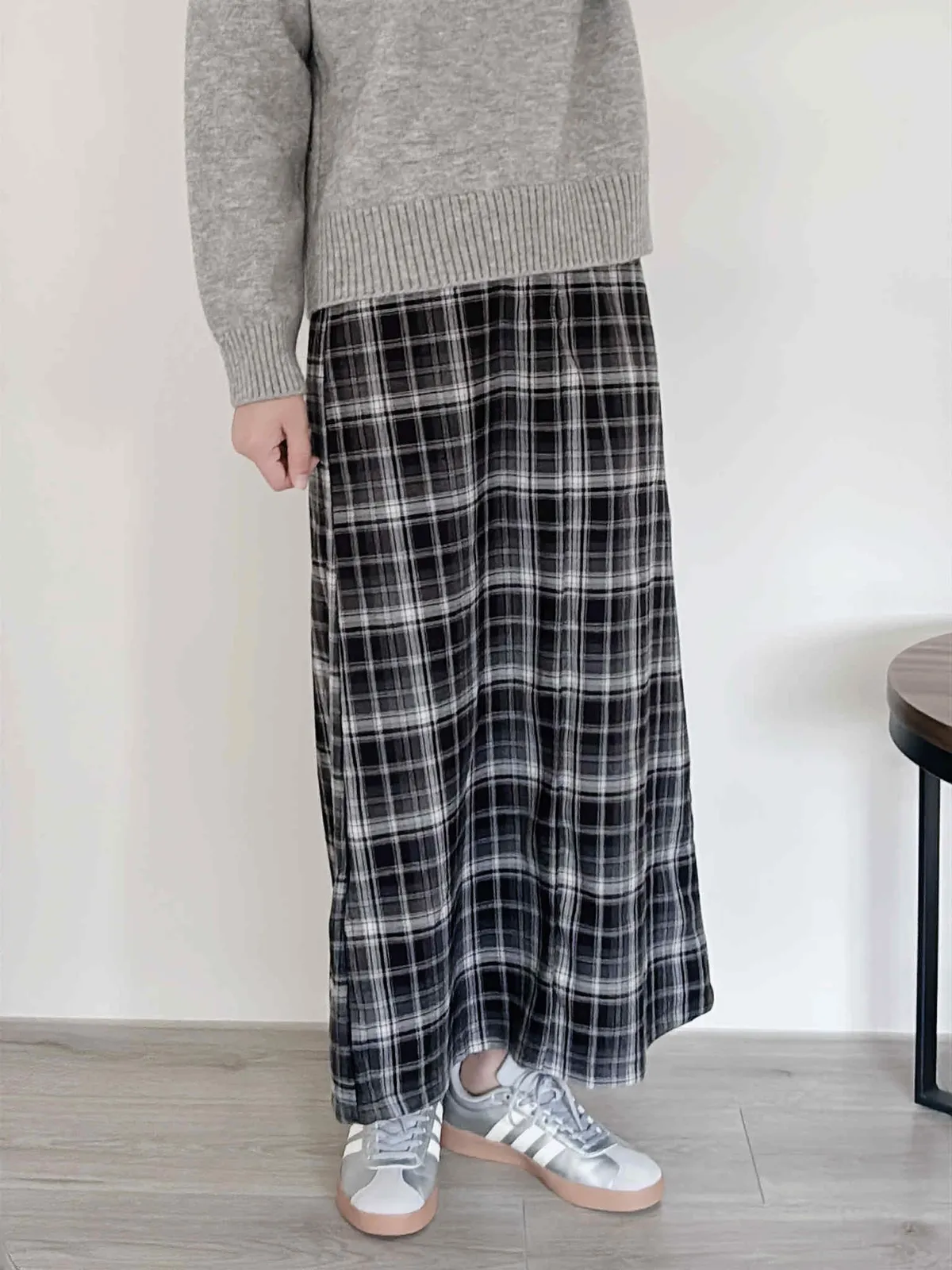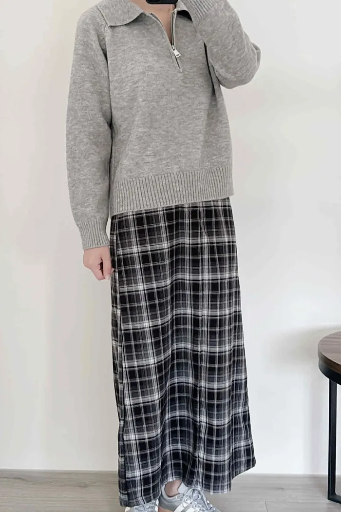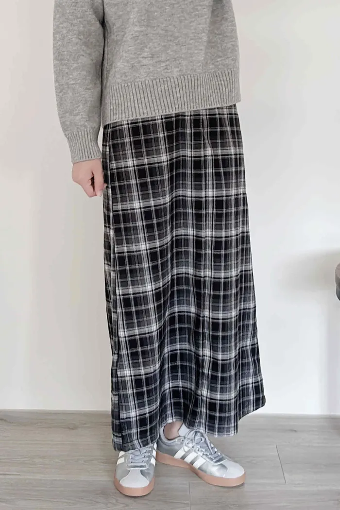 後開衩格紋西裝長裙/後鬆緊腰/有口袋