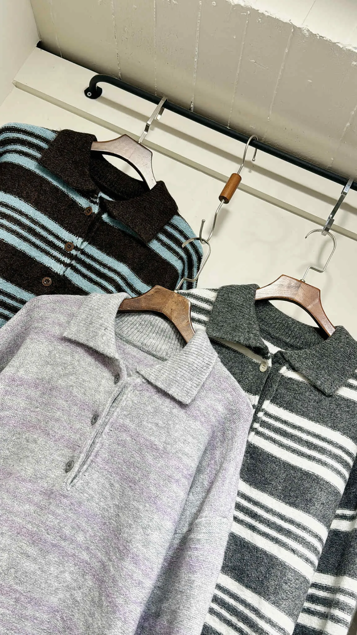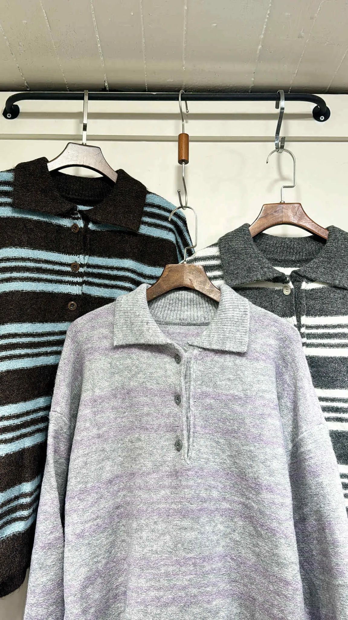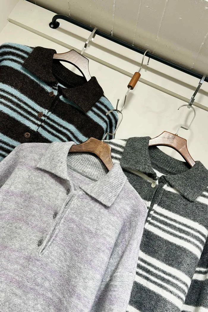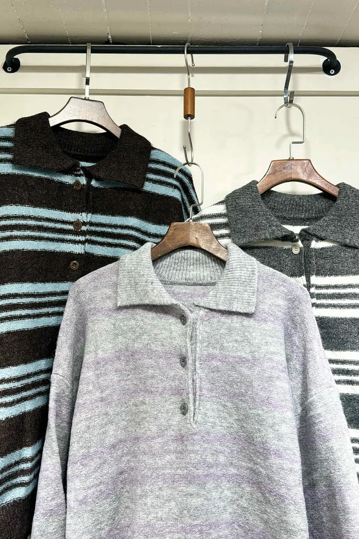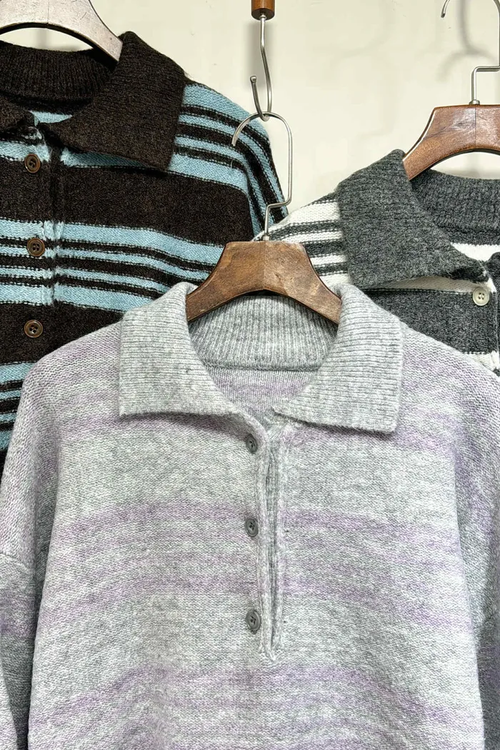輕量款/小圓釦翻領條紋針織上衣/大胸友善